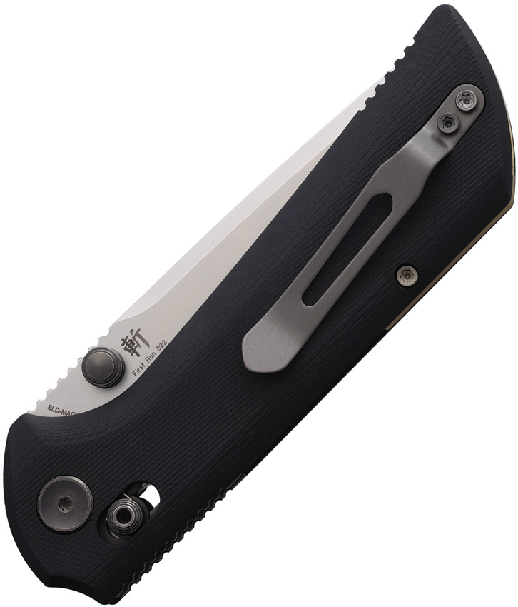 4.75″ (12.07cm) closed. 3.75″ (9.53cm) blade. Black G10 handle. Thumb stud. Pocket clip. SLD-Magic steel tanto blade. Gold finish backspacer. Black molded plastic storage case. Boxed.