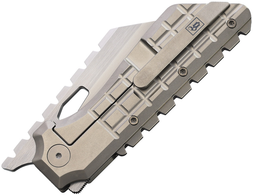 4.25″ (10.8cm) closed. 3.38″ (8.59cm) blade. Gray sculpted titanium handle. Extended tang. Thumb pull. Pocket clip. SLD-Magic steel blade. Jason Grant design. Molded plastic storage case. Boxed.