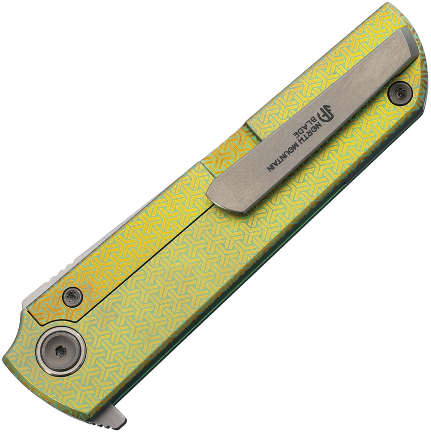 4.25″ (10.8cm) closed. 3.25″ (8.26cm) satin finish tanto blade. Teal and gold anodized titanium handle. Pocket clip. ZDP-189 steel blade. Kickstop hidden flipper. Lee Williams collaboration. Geometric handle artwork. Black molded plastic storage case. Boxed.