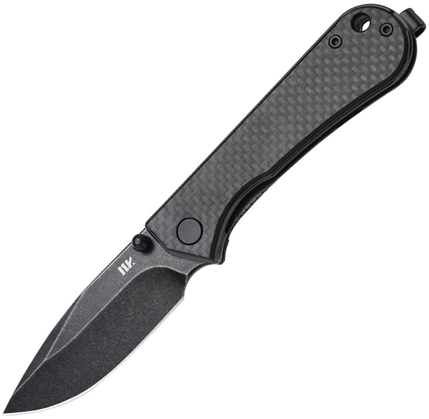 4″ (10.16cm) closed. 3″ (7.62cm) black stonewash finish D2 tool steel drop point blade. Carbon fiber handle. Thumb stud. Extended tang. Lanyard hole. Pocket clip. Zippered storage case.