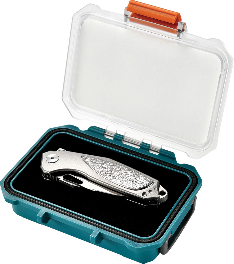 3.75″ (9.53cm) closed. 2.63″ (6.68cm) stonewash and satin finish Bohler M390 stainless drop point blade. Gray hammered titanium handle. Extended tang. Lanyard hole. Pocket clip. Thumb pull. Comes in waterproof storage case.