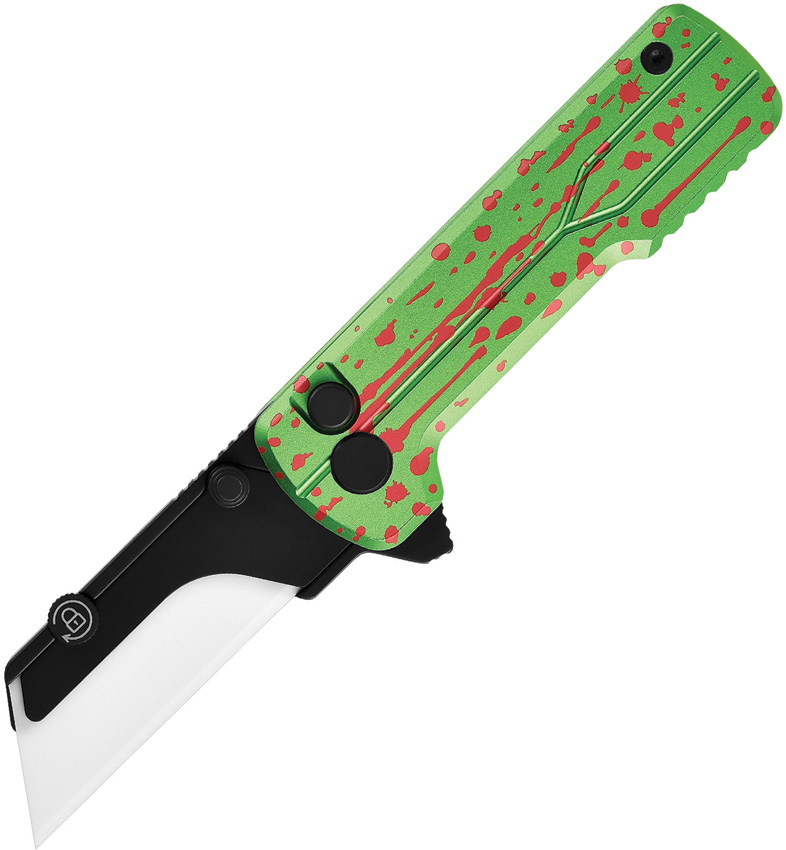 3.38″ (8.59cm) closed. 2.38″ (6.05cm) blade. Extended tang. Thumb stud. Pocket clip. Standard trapezoidal shape zirconium oxide ceramic blade. Black oxide blade holder. Zombie green OAL super aluminum handle. Boxed.