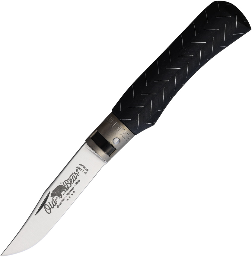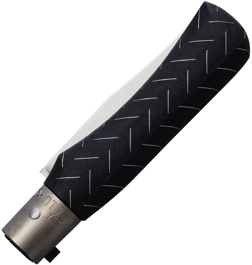 4″ (10.16cm) closed. 2.75″ (6.99cm) blade. Locking safety ring. 1.4060 stainless blade. Black laminated wood and aluminum handle. Boxed.
