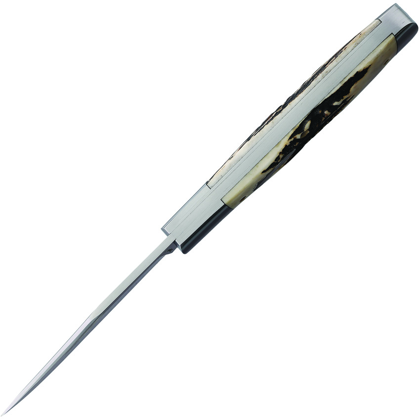 4.13″ (10.49cm) closed. Satin finish VG-10 stainless clip blade. Stag handle. Nickel silver bolster(s). Inlay shield. Boxed.