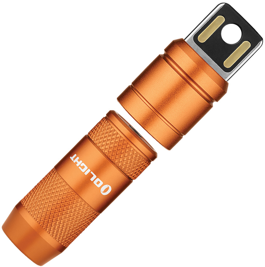 Dimensions: 2.17″ x 0.59″. Water resistant. Rechargeable. Cool white LED. 50 lumens, 60m runtime. 21m beam distance. Magnetic. Requires (1) Lithium battery (included). Aluminum construction. Color: Orange. Boxed.