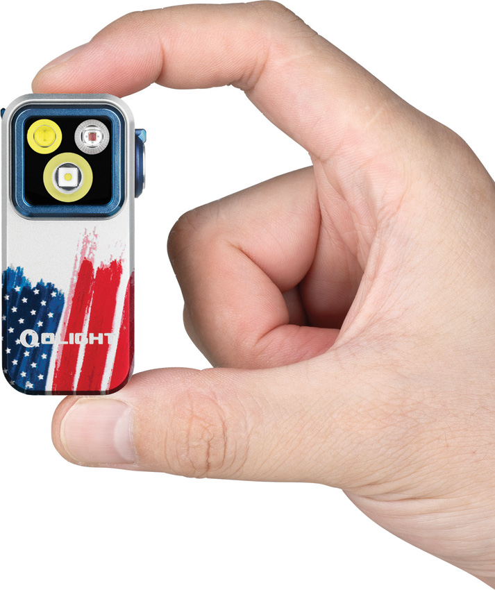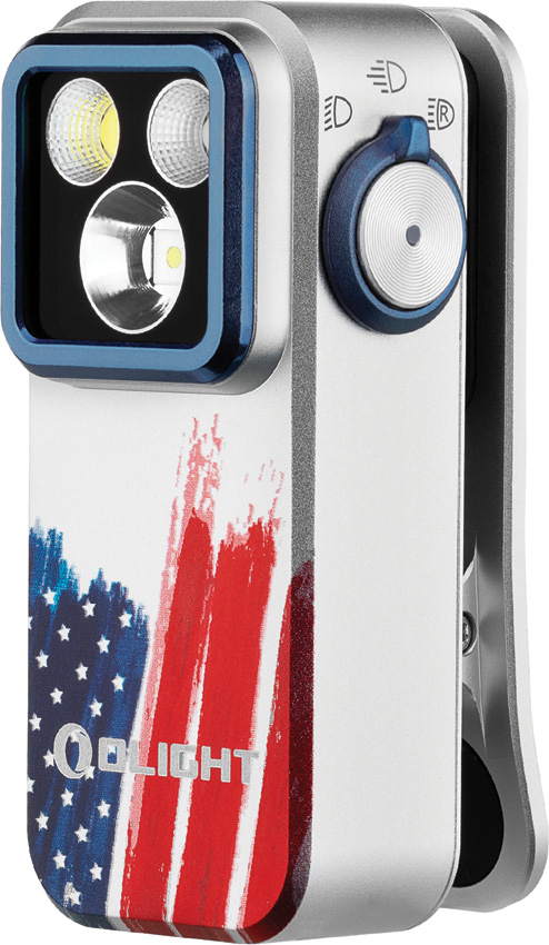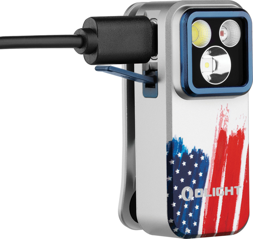Dimensions: 2.25″ x 1.1″. SOS strobe. Strobe. Water resistant. Impact resistant. Clip. Rechargeable. Side switch operation. White and red LEDs. USB-C charging. 120m beam distance. Modes: Floodlight-Turbo (500-300-100 lumens, 1+50+30m runtime); High (300-180-100 lumens, 1+100+10m runtime); Medium (100 lumens, 3.5h runtime); Low (10 lumens, 27h runtime); Moon (1 lumen, 144h runtime); Spotlight-Turbo (380-240-85 lumens, 1+50+30m runtime); High (240-150-85 lumens, 1+100+10m runtime); Medium (85 lumens, 3.5h runtime); Low (9 lumens, 27h runtime); Moon (1 lumen, 144h runtime); Red (40 lumens). Glass lens. Requires (1) Lithium battery (included). Aluminum construction. Color: Stars and stripes. Boxed.