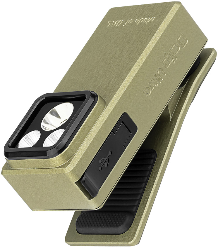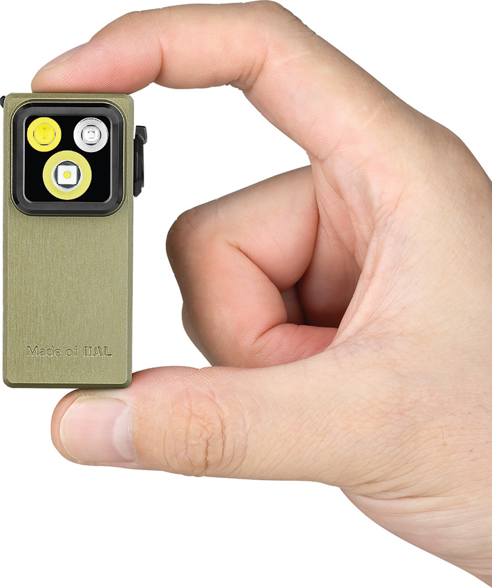 Dimensions: 2.94″ x 1.1″ x 1.1″. Rechargeable. Water resistant. Impact resistant. SOS strobe. Clip. Floodlight 45m beam distance. Spotlight 130m beam distance. USB-C charging. Side switch. Modes: Floodlight-Turbo (500-300-100 lumens, 1+50+30m runtime); High (300-180-100 lumens, 10+80+20m runtime); Medium (100 lumens, 3.5h runtime); Low (10 lumens, 27h runtime); Moon (1 lumen, 144h runtime). Spotlight-Turbo (450-270-90 lumens, 1+50+30m runtime); High (270-160-90 lumens, 10+80+20m runtime); Medium (90 lumens, 3.5h runtime); Low (9 lumens, 27h runtime); Moon (1 lumen, 144h runtime). Requires (1) Lithium battery (included). OAL (O-Aluminum) construction. Color: Olive green. Boxed.