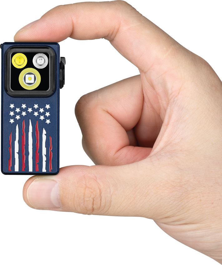 Dimensions: 2.94″ x 1.1″ x 1.1″. Rechargeable. Water resistant. Impact resistant. SOS strobe. Clip. Floodlight 45m beam distance. Spotlight 130m beam distance. USB-C charging. Side switch. Modes: Floodlight-Turbo (500-300-100 lumens, 1+50+30m runtime); High (300-180-100 lumens, 10+80+20m runtime); Medium (100 lumens, 3.5h runtime); Low (10 lumens, 27h runtime); Moon (1 lumen, 144h runtime). Spotlight-Turbo (450-270-90 lumens, 1+50+30m runtime); High (270-160-90 lumens, 10+80+20m runtime); Medium (90 lumens, 3.5h runtime); Low (9 lumens, 27h runtime); Moon (1 lumen, 144h runtime). Requires (1) Lithium battery (included). OAL (O-Aluminum) construction. Color: Stars and stripes. Boxed.