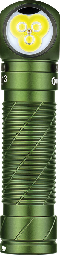 4.59″ overall. Water resistant. Impact resistant. Rechargeable. SOS strobe. White and red LEDs. Large metal side button. Metal headlamp mounting bracket. 160m beam distance. MCC3 magnetic charging cable. Modes: Turbo (3000-800-600 lumens, 2+180+30m runtime); High (600-120 lumens, 300+30m runtime); Medium (120 lumens, 25h runtime); Low (30 lumens, 89h runtime); Moon (5 lumens, 20 day runtime); Red-High (60 lumens, 14h runtime); Red-Low (15 lumens, 70h runtime). Nylon headband. Requires (1) 21700 battery (included). Aluminum construction. Color: OD Green. Boxed.