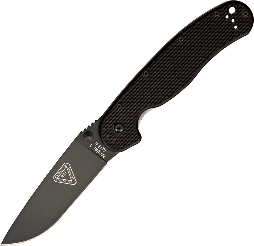 RAT. 5″ (12.7cm) closed. 3.50″ (8.89cm) black finish AUS-8 stainless blade. Black nylon handle. Thumb stud. Pocket clip. Lanyard hole. Boxed.