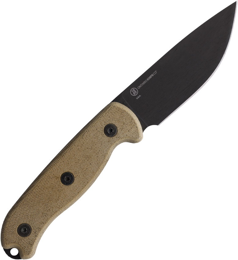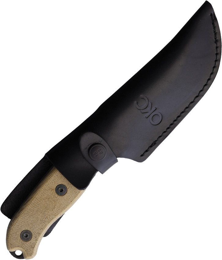 10″ (25.4cm) overall. 4.25″ (10.8cm) black coated 1075HC steel blade. Natural canvas micarta handle. Lanyard hole. Full, extended tang. Includes extra set of wood handle scales. Black leather belt sheath. Boxed.