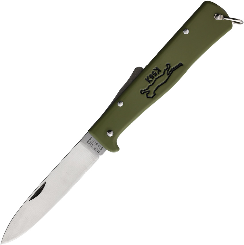 4.38″ (11.13cm) closed. 3.38″ (8.59cm) satin finish stainless spear point blade. Olive stainless handle. Bail. Hang packaged.