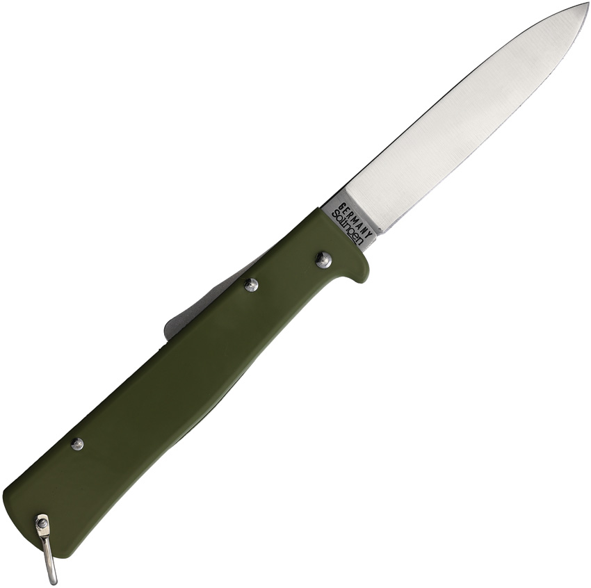 4.38″ (11.13cm) closed. 3.38″ (8.59cm) satin finish carbon steel spear point blade. Olive stainless handle. Bail. Hang packaged.