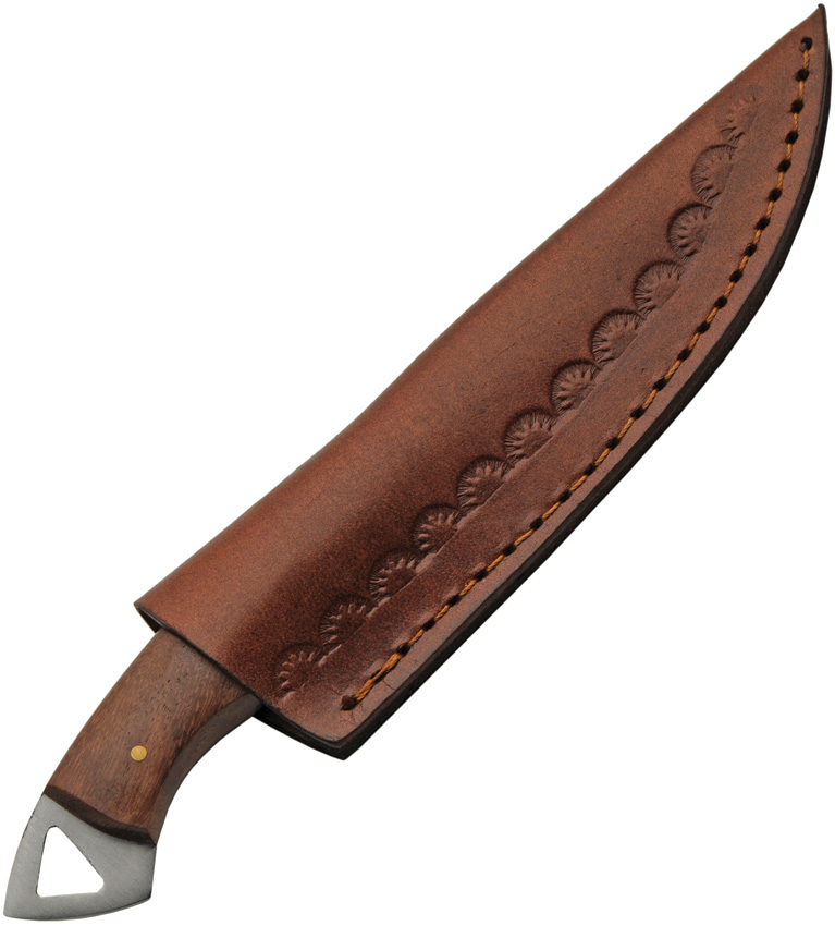 7″ (17.78cm) overall. 3″ (7.62cm) satin finish stainless trailing point blade. Brown wood handle. Full, extended tang. Lanyard hole. Brown leather belt sheath. Boxed.