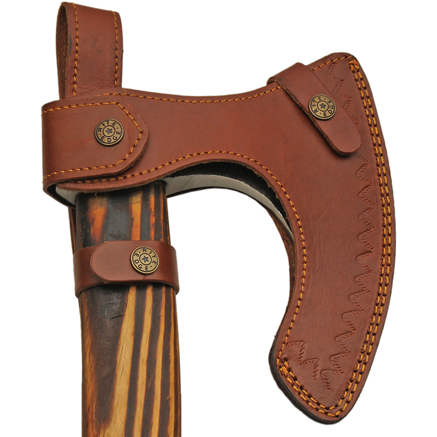 23″ overall. 6.25″ stainless axe head with 7.25″ cutting edge. Burnt ash wood handle. Raven of Odin artwork on axe head. Brown leather belt sheath. Boxed.
