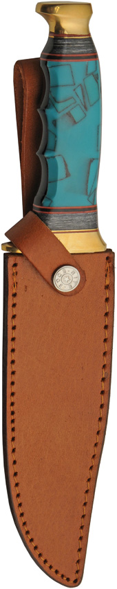 12.25″ (31.12cm) overall. 7.25″ (18.42cm) satin finish stainless blade. Turquoise finger grooved resin handle. Brass guard and pommel. Brown leather belt sheath. Boxed.