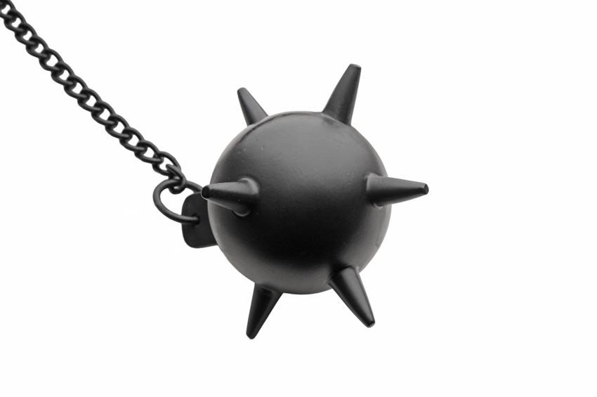 28″ overall. Wood handle. 6″ diameter black cast iron mace with spikes. Metal chain. Boxed.