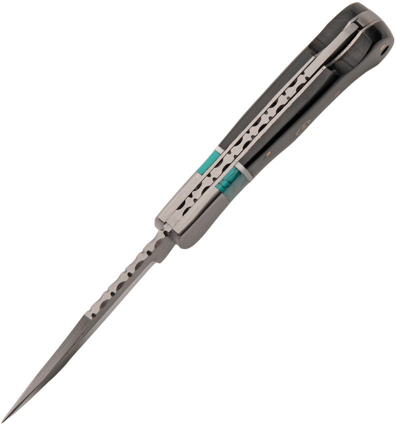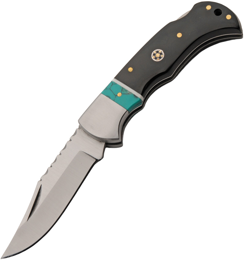 3.75″ (9.53cm) closed. 2.75″ (6.99cm) satin finish stainless clip point blade. Buffalo horn handle. Lanyard hole. Faux turquoise inlay. Boxed.