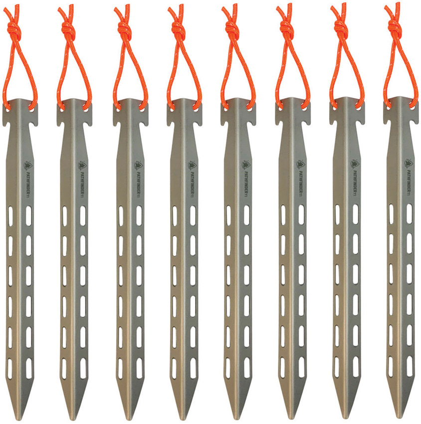 Dimensions: 8.5″ x 0.75″. Weight: 0.9oz. Set of eight. Reflective cords. Comes in nylon drawstring bag. Titanium construction. Boxed.