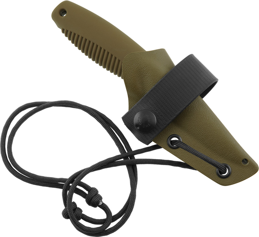 4″ (10.16cm) overall. 2.5″ (6.35cm) Scandi grind 80CrV2 carbon steel blade. Coyote brown TPE handle. Lanyard hole. Coyote brown Kydex neck sheath. Boxed with hanging tab.