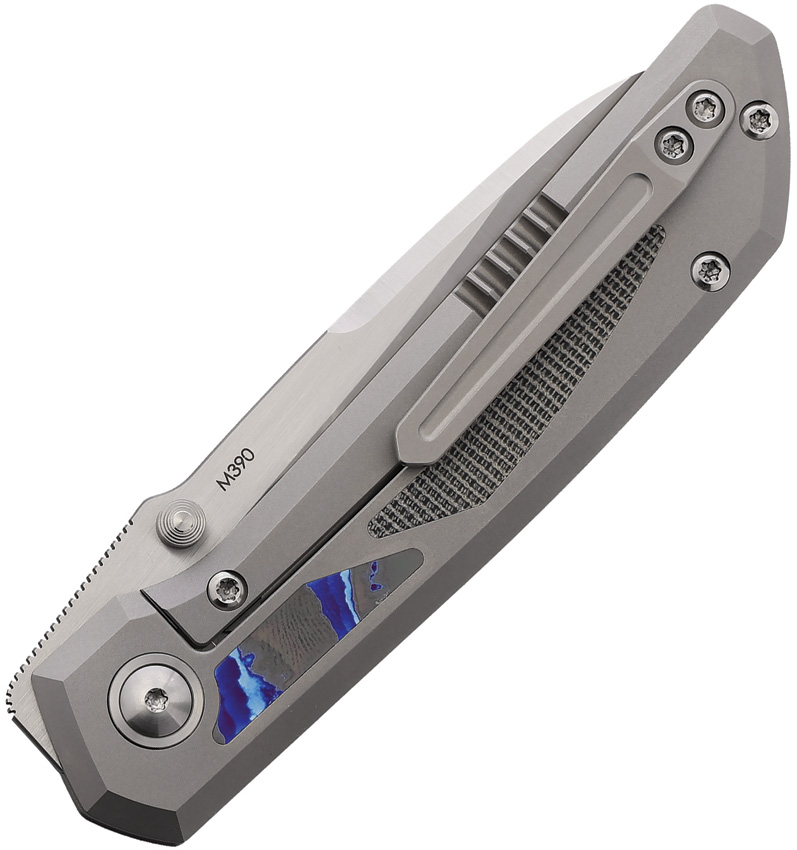 4.38″ (11.13cm) closed. 3.25″ (8.26cm) satin finish Bohler M390 stainless sheepsfoot blade. Gray titanium handle with Black micarta and Mokuti inlays. Thumb stud. Extended tang. Pocket clip. Boxed.