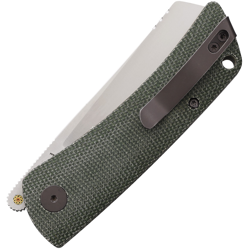 4.13″ (10.49cm) closed. 3.13″ (7.95cm) satin finish Bohler K110 stainless cleaver style blade. Green canvas micarta handle. Extended tang. Lanyard hole. Pocket clip. Boxed.