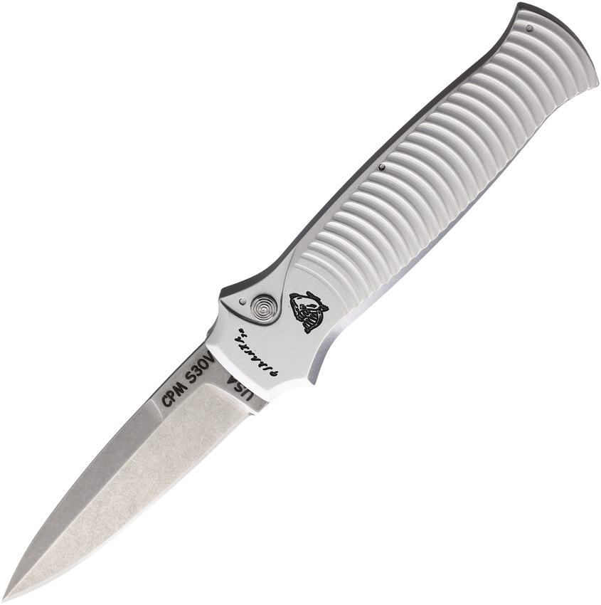Automatic opening. 4.5″ (11.43cm) closed. 3.25″ (8.26cm) stonewash finish CPM S30V stainless blade. Silver sculpted aluminum handle. Pocket clip. Boxed.
