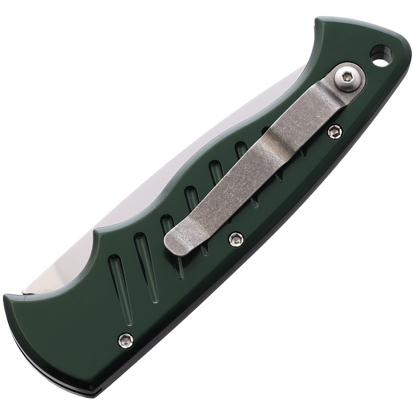Automatic opening. 4.13″ (10.49cm) closed. 3.25″ (8.26cm) satin finish 154CM stainless blade. Green aluminum handle. Lanyard hole. Pocket clip. Boxed.