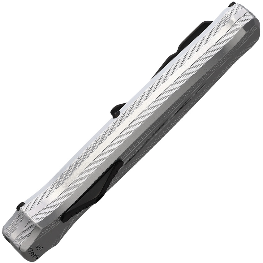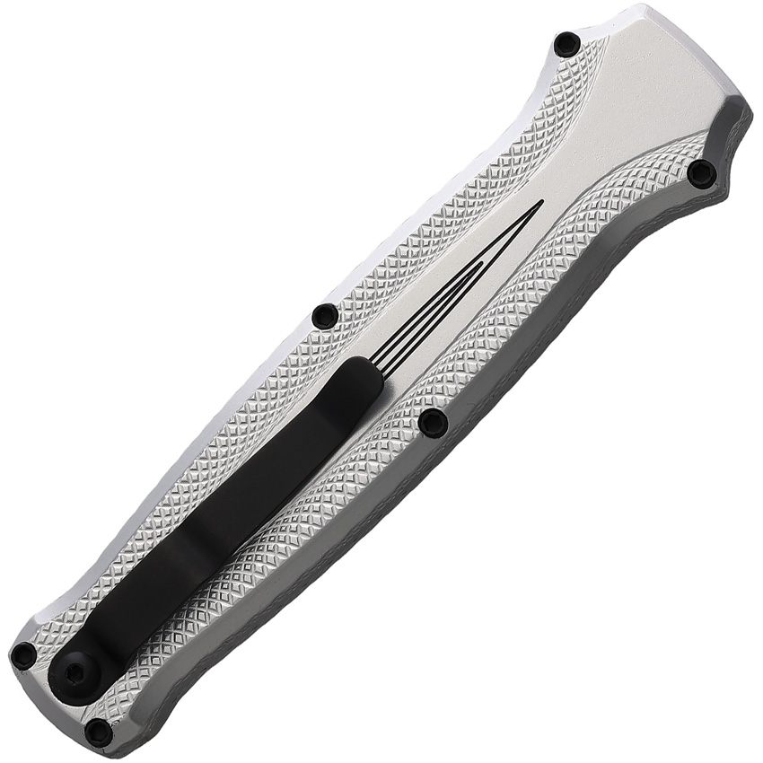 Automatic opening. 4.63″ (11.76cm) closed. 3.5″ (8.89cm) black DLC coated 154CM stainless clip point blade. Silver aluminum handle. Pocket clip. Boxed.