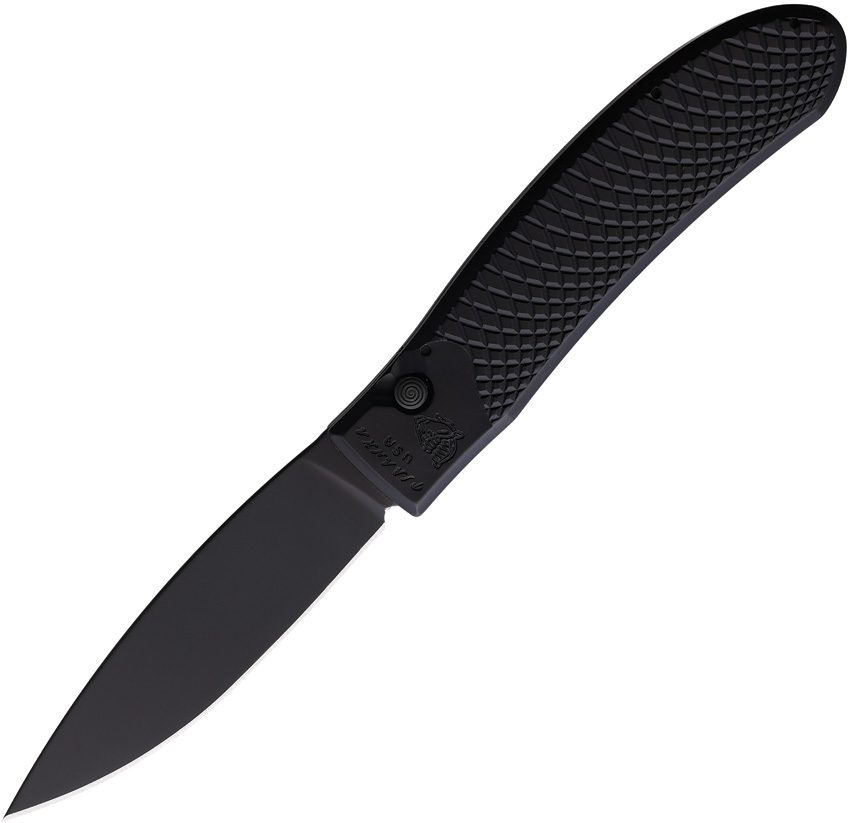 Automatic opening. 4.75″ (12.07cm) closed. 3.75″ (9.53cm) black oxide coated 154CM stainless blade. Black textured aluminum handle. Pocket clip. Boxed.
