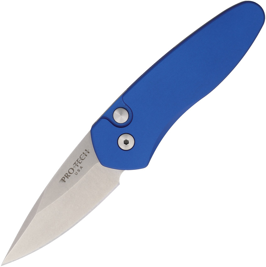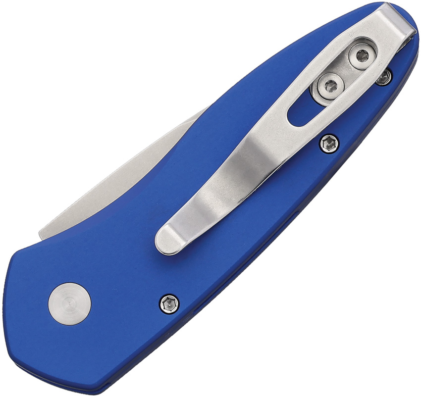 Automatic opening. 3″ (7.62cm) closed. 2″ (5.08cm) stonewash finish S35VN stainless spear point blade. Blue aluminum handle. Pocket clip. Boxed.