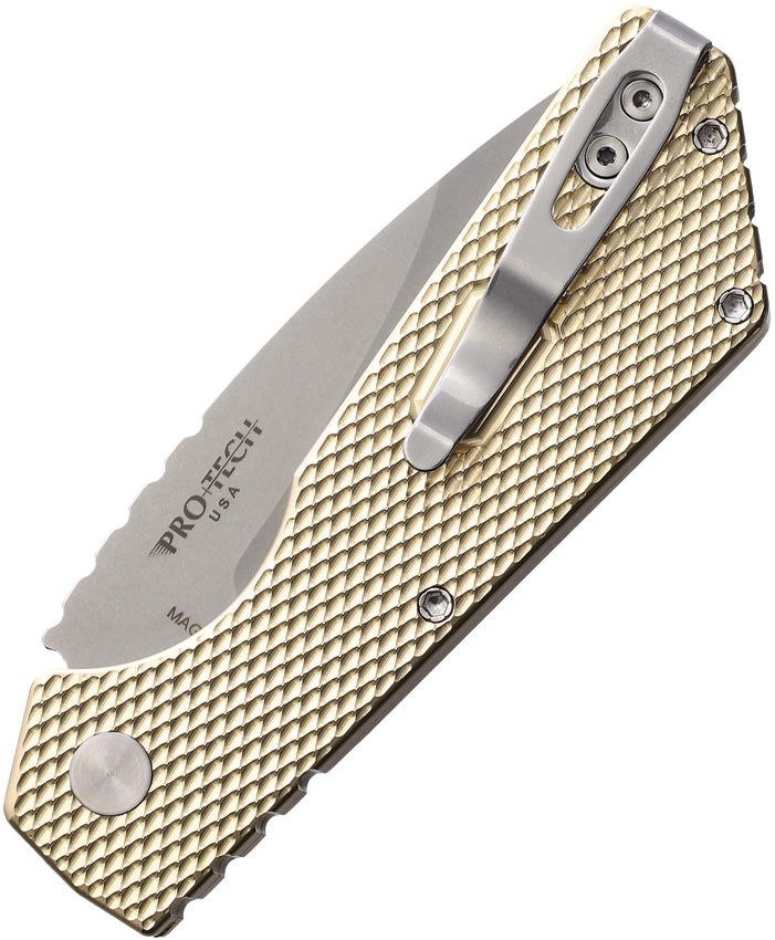 4″ (10.16cm) closed. 3″ (7.62cm) stonewash finish MagnaCut steel blade. Bronze checkered aluminum handle. Pocket clip. Boxed.