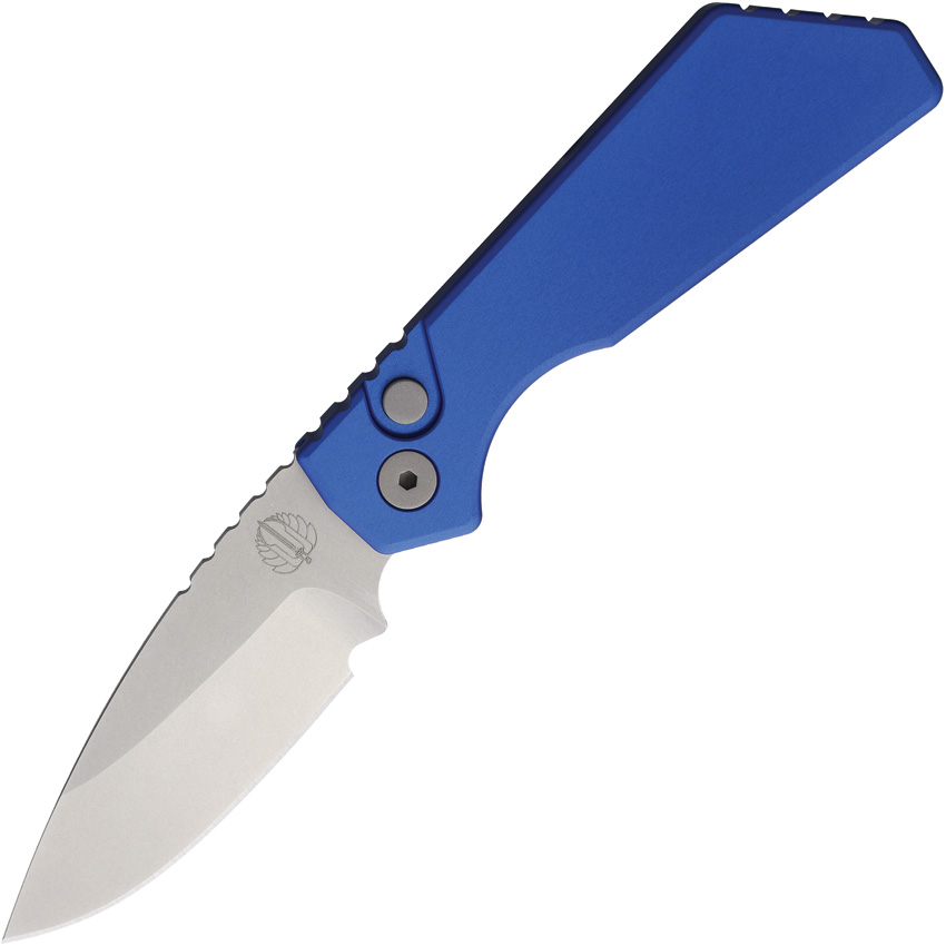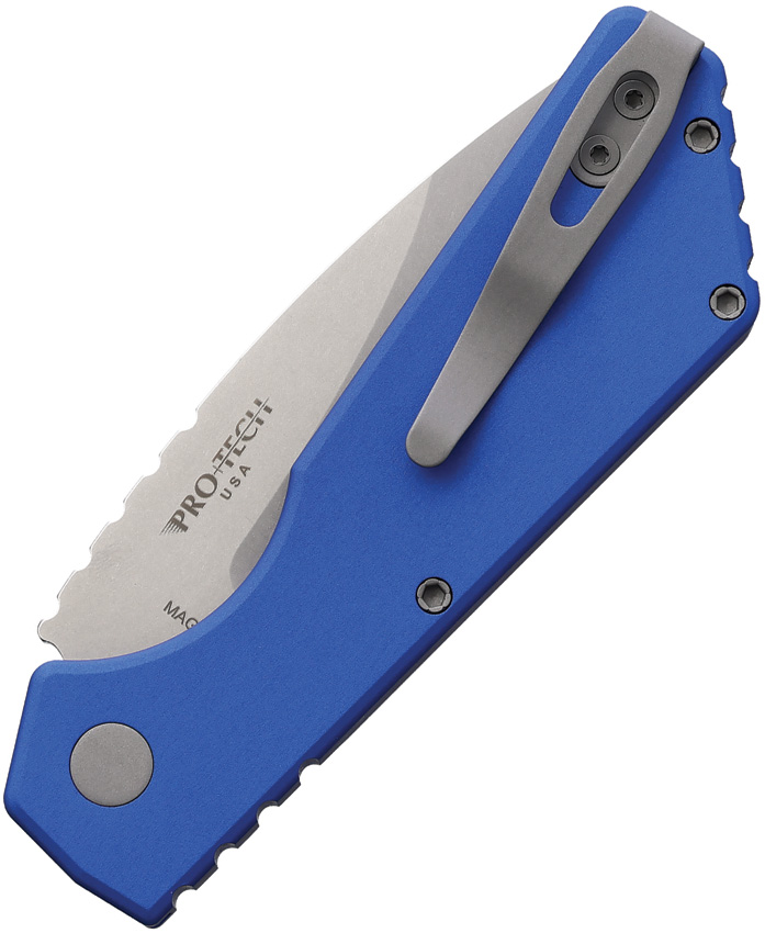 Automatic opening. 3.88″ (9.86cm) closed. 2.88″ (7.32cm) stonewash finish MagnaCut steel blade. Blue aluminum handle. Pocket clip. Boxed.