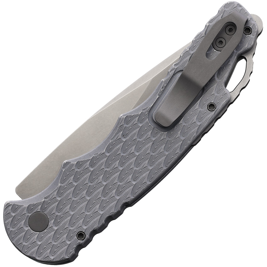 Automatic opening. 5.25″ (13.34cm) closed. 4″ (10.16cm) stonewash finish 154CM stainless drop point blade. Gray textured aluminum handle. Lanyard hole. Pocket clip. Boxed.