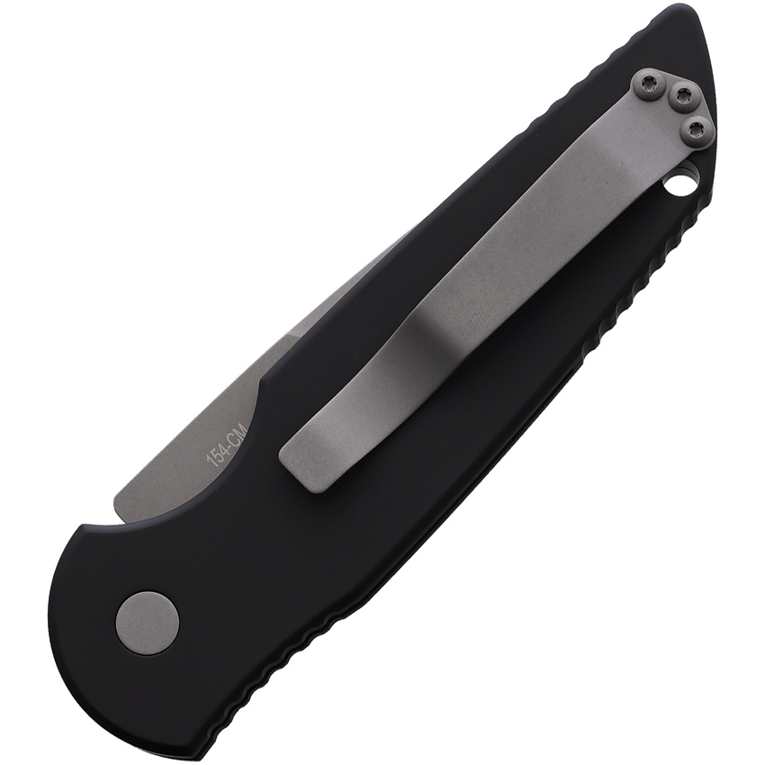 Automatic opening. 4.5″ (11.43cm) closed. 3.5″ (8.89cm) stonewash finish 154CM stainless drop point blade. Black sculpted aluminum handle. Lanyard hole. Pocket clip. Boxed.