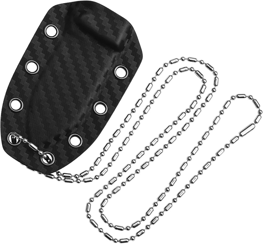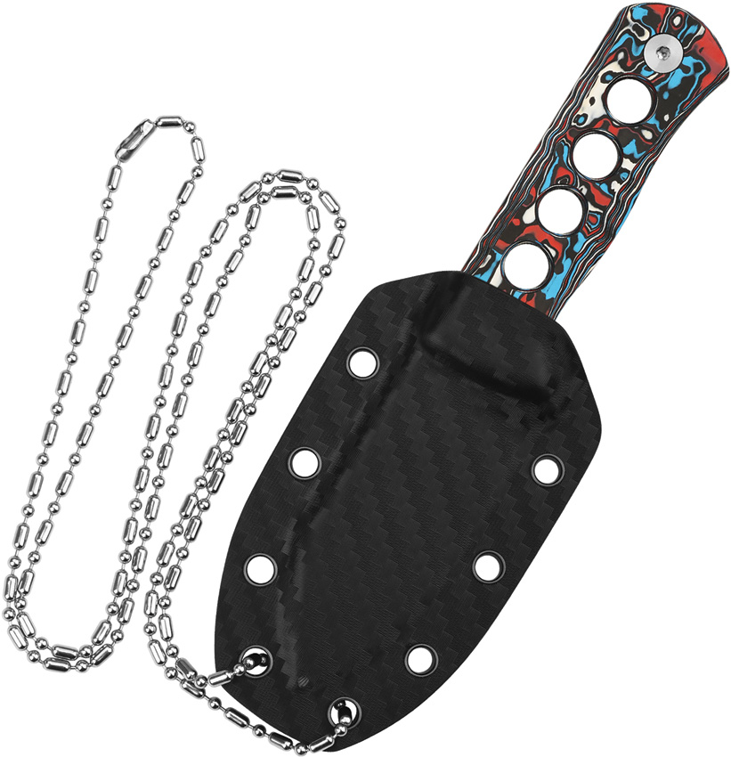 5.25″ (13.34cm) overall. 2.5″ (6.35cm) Damascus steel blade. Red, white, and blue carbon fiber handle. Full tang. Black Kydex neck sheath. Boxed.