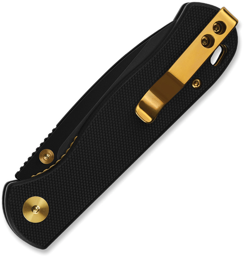 4″ (10.16cm) closed. 3″ (7.62cm) black coated Nitro V steel drop point blade. Black G10 handle. Thumb stud. Lanyard hole. Pocket clip. Gold accents. Boxed.