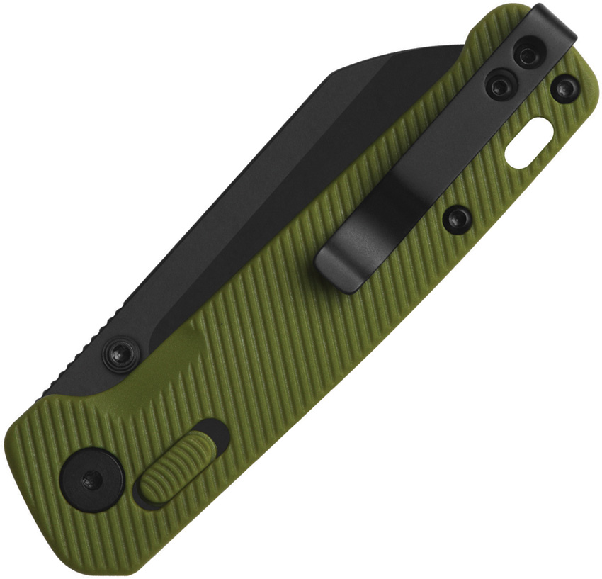 4″ (10.16cm) closed. 3″ (7.62cm) black finish 14C28N Sandvik stainless sheepsfoot blade. OD green FRN handle. Thumb stud. Lanyard hole. Pocket clip. Boxed.