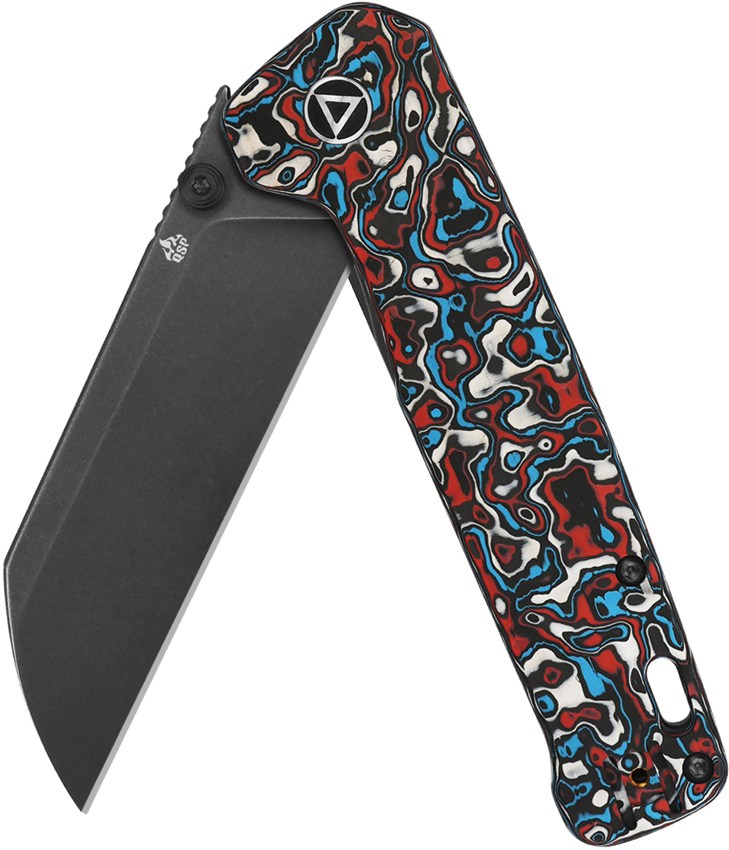 - 3.38″ (8.59cm) black stonewash finish CPM-20CV stainless blade. Red, white, and blue carbon fiber handle with black stonewash finish titanium back handle.