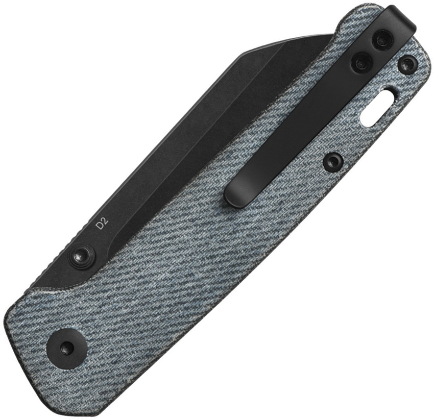 4″ (10.16cm) closed. 3″ (7.62cm) black stonewash finish D2 tool steel sheepsfoot blade. Denim micarta handle. Thumb stud. Lanyard hole. Pocket clip. Boxed.