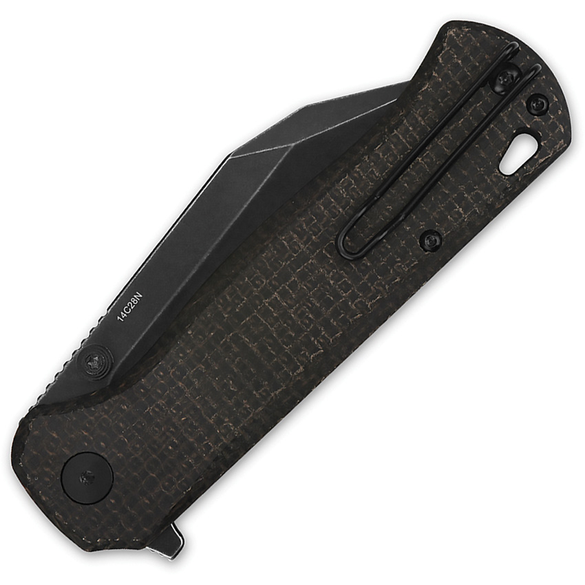 4.5″ (11.43cm) closed. 3.63″ (9.22cm) black stonewash finish 14C28N Sandvik stainless blade. Dark brown micarta handle. Thumb stud. Lanyard hole. Pocket clip. Extended tang. Boxed.