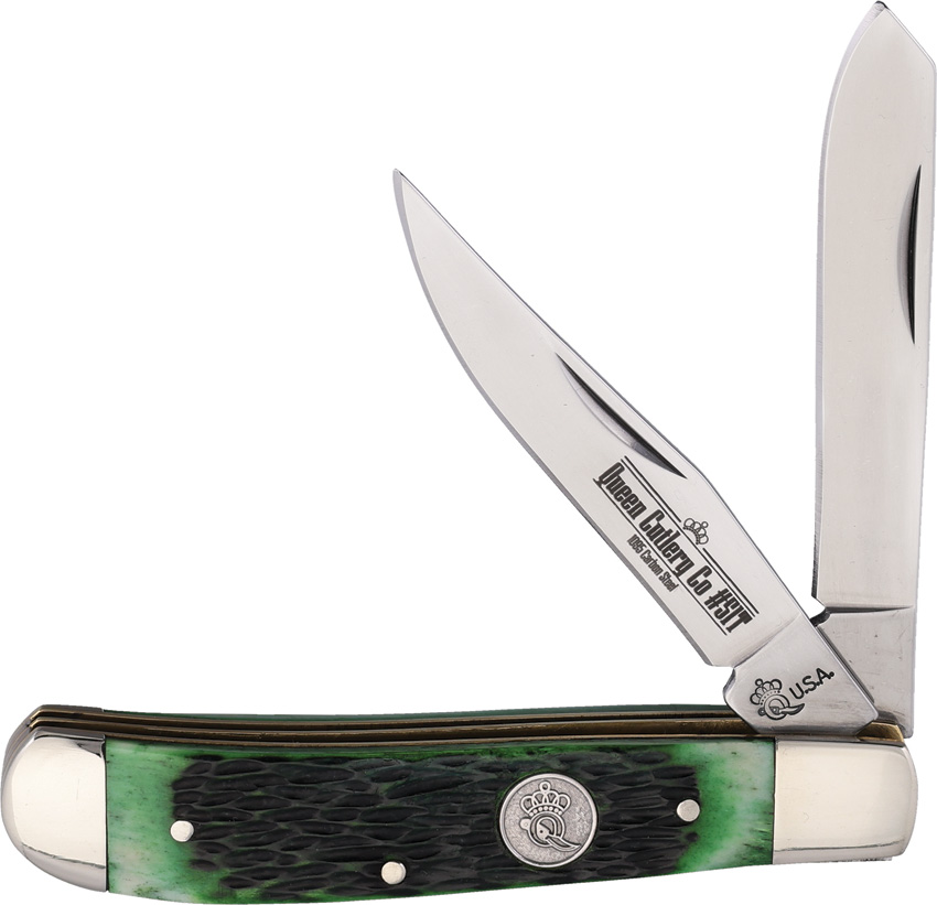 3.5″ (8.89cm) closed. Mirror finish stainless clip and spey blades. Green jigged bone handle. Nickel silver bolster(s). Inlay shield. Gift tin.