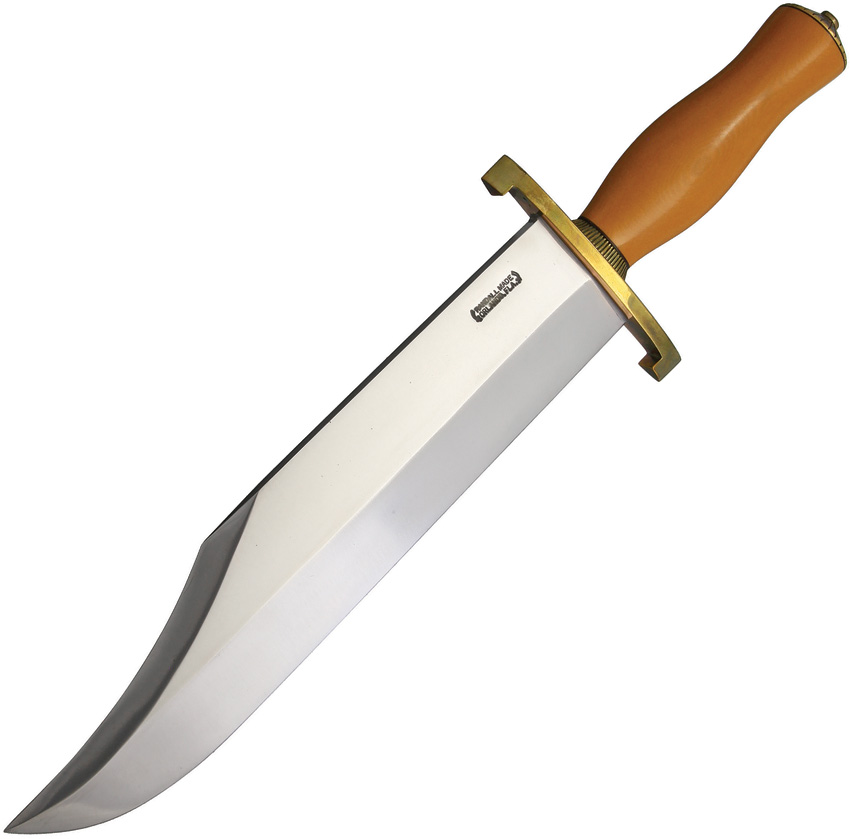 Smithsonian Bowie. 16 3/8″ overall length. 11″ carbon steel blade. Westinghouse yellow micarta handles with black fiber brass spacers. Lugged brass double hilt with scalloped brass collar and scalloped brass butt cap. Brown leather sheath with sharpening stone. This knife is from a collection purchase and is in like near mint condition. Sheath shows signs of handling.