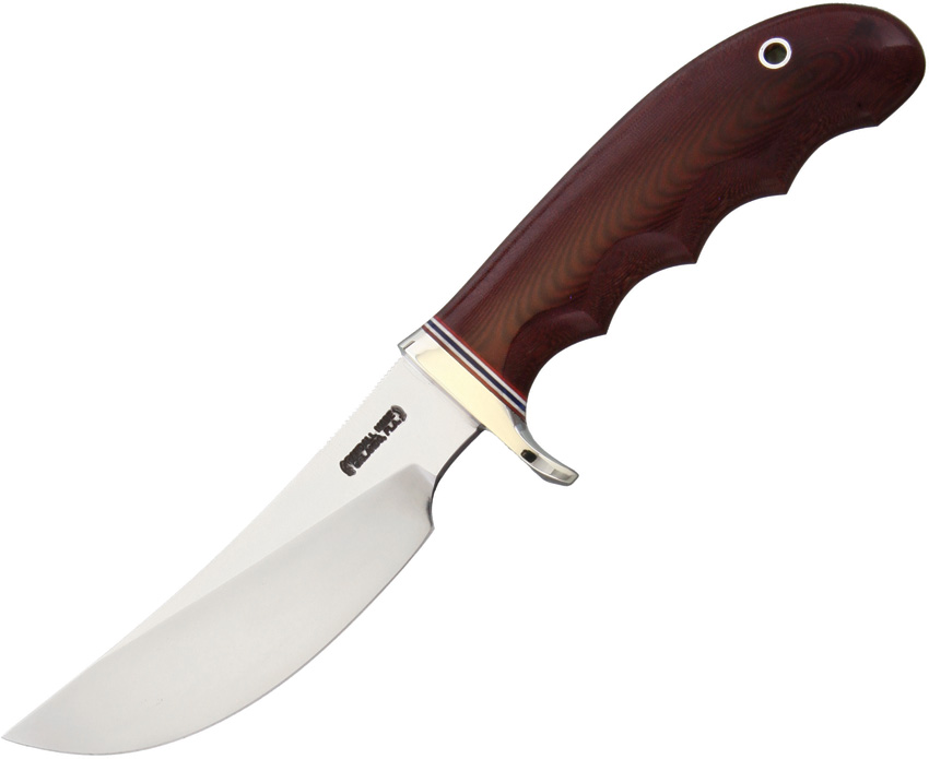 Yukon Skinner. Non-Catalog Model. 9″ overall length. 4 1/2″ carbon steel blade. Maroon micarta handle with finger grips and wrist thong. Nickle silver hilt with red white and blue fiber spacers. Brown leather sheath with sharpening stone. Brand new from Randall.
