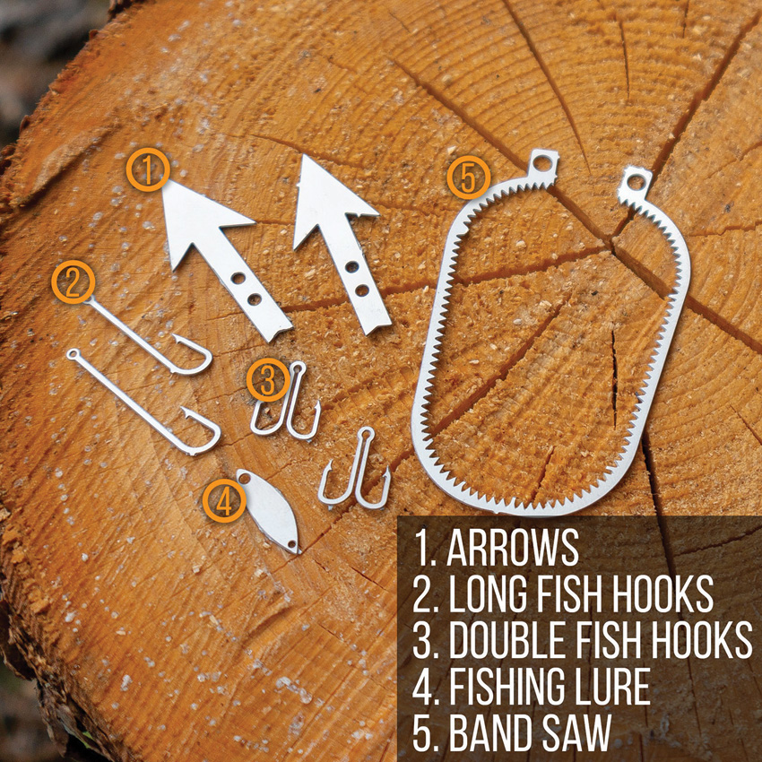 Dimensions: 2.38″ x 1.25″. Each tool is made to bend and pop out. Tools include: (2) double fishing hooks, (2) long fishing hooks, (2) arrowheads, (1) fishing lure, (1) band saw (outer edge). 301 stainless construction. Bulk packed.