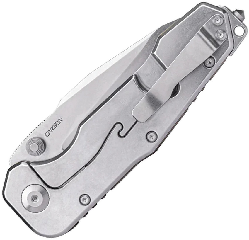 5″ (12.7cm) closed. 3.75″ (9.53cm) stonewash finish D2 tool steel drop point blade. Black G10 handle with stonewash finish stainless back handle. Lanyard hole. Glass breaker. Thumb stud. Pocket clip. Boxed.