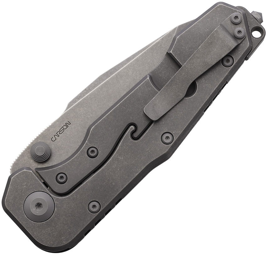 4.88″ (12.4cm) closed. 3.88″ (9.86cm) stonewash finish S35VN stainless tanto blade. Shredded carbon fiber handle with titanium back handle. Thumb stud. Glass breaker. Lanyard hole. Pocket clip. Boxed.
