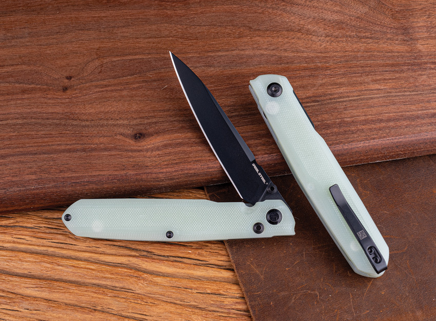 4.5″ (11.43cm) closed. 3.5″ (8.89cm) black PVD coated 14C28N Sandvik stainless blade. Jade G10 handle. Thumb stud. Pocket clip. Boxed.
