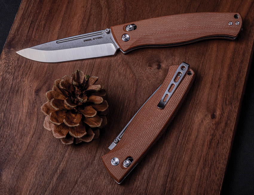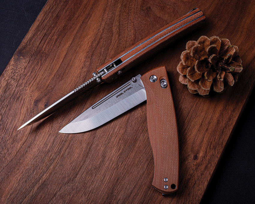 5″ (12.7cm) closed. 3.88″ (9.86cm) stonewash and satin finish Scandi grind 14C28N Sandvik stainless blade. Brown canvas micarta handle. Thumb stud. Lanyard hole. Pocket clip. Boxed.