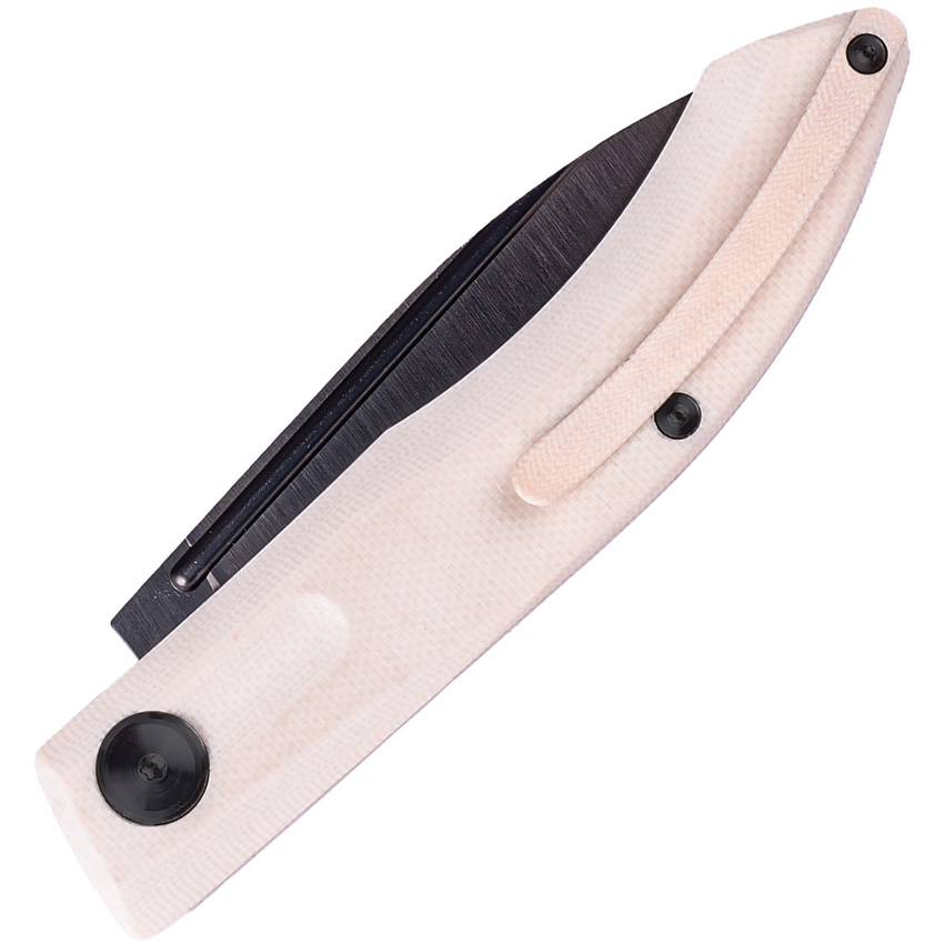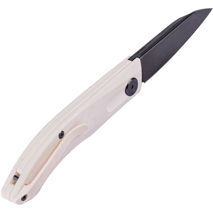 4″ (10.16cm) closed. 3″ (7.62cm) black DLC coated K110 tool steel blade. Ivory G10 handle. Pocket clip. Slip joint. Boxed.